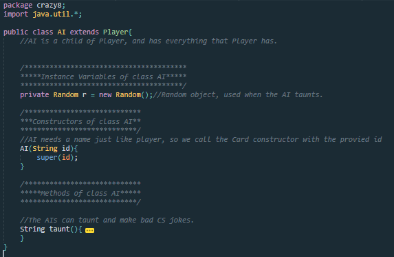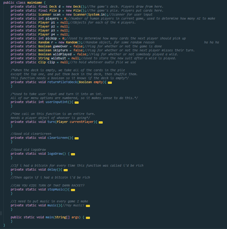 The mainGame class is, well, the main game. It's responsible for creating instances of all the other classes. Most importantly, it gives each player options to view their cards, play a card, pick up a card, and sort their cards when it is their turn. The game class creates the proper number of Players and AIs depending on how many people are playing. The game class is what writes all those messages to the screen so the user knows what's going on. Imagine if I just got rid of every single System.out.println("");.