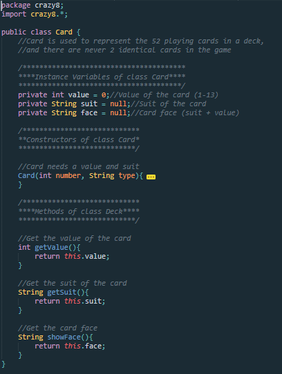 The Card class is kind of important to this game. Each individual card has an int representing it's numerical value, a String representing it's suit, and a String representing the face of the Card (♣5, for example). When created, a Card object needs an int value and a String suit, because most cards have values and suits, right? Cards can return their values in the form of an int, their suits in the form of a String, and their face in the form of a String.