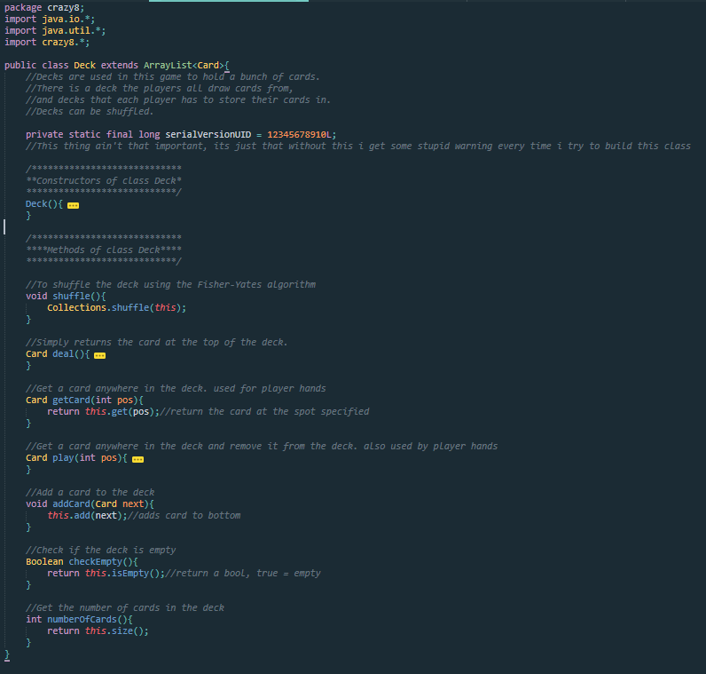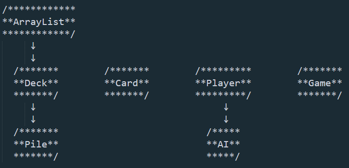 The Deck class is a child of Java's ArrayList, and so it can be resized and added to and everything just like an ArrayList. A Deck requires no parameters to be created, and is initialized with all 52 cards inside. Decks can be shuffled using the Fisher-Yates algorithm, can return the Card at the top of the Deck, or when given an int value return a Card at that position in the array. Deck can play a card from a specific spot in the deck, which returns a Card and then removes it from the Deck. When given a Card, it can be added to the Deck. Deck can return a boolean value indicating whether or not it is empty, as well as an integer representing the numer of Cards contained within. Deck is used for the deck that all players draw from, as well as each player's indiviual hands.