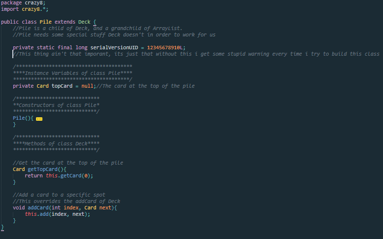 The Pile class is a child of the Deck class, so it can do everything a Deck can do, only better. Well, that"s debatable. It's created the same way as Deck, but does not contain any cards upon being initialized. Pile can return information on the Card at the top of the Pile, and Cards can be added to the Pile at a specific int position. Pile is used to hold all of the disCARDed cards.