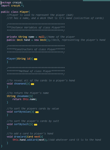 Every player is assigned a 'Player' object. Each object has a String to hold their name, and a hand of cards, which is a Deck object. The hand is public, so that all parts of the game can access it. Player objects require a name in the form of a String to be created. Player objects can show all of the cards in their hand, return the name of the player, add a card to the player's hand when given a card, and sort the cards in the hand by value and suit.