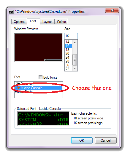 Select "Lucida Console" as the font, and click "OK".